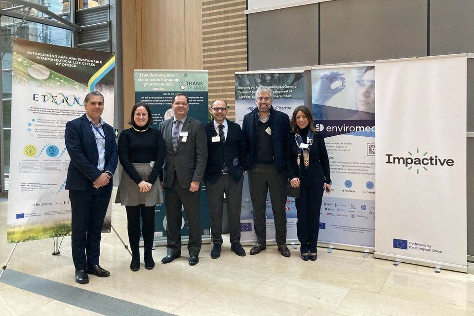 Paz Sebatia Luna (second from left) is pictured with (from left to right) European Commission host Martin Uriarte Asteinza, and Professors Christian Stevens from TRANSPHARM, Renzo Luisi (SUSPHARMA), Stefan Camarinopoulos (ENVIROMED), and Evelina Colacino (IMPACTIVE). The ETERNAL project was also represented at the meeting by John Henderson from Britest, Belén Monje Martínez from AIMPLAS, Maria Pavlaki and Patrícia Silva from CESAM at the University of Aveiro, Sam Harrison from UKCEH and Micheál Galvin from Enviroeye.